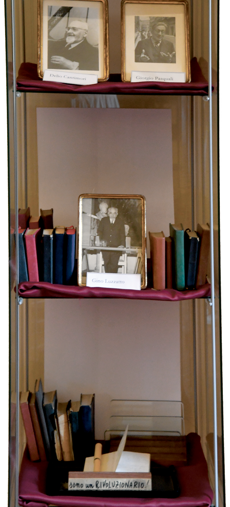 Ad esse si accompagna parte rilevante dell’originaria ambientazione veneziana dei loro studi privati, qui richiamati con testimoni sia di maestri (Delio Cantimori, Gino Luzzatto e Giorgio Pasquali, vd. vetrinetta) che di presenze storiografiche.